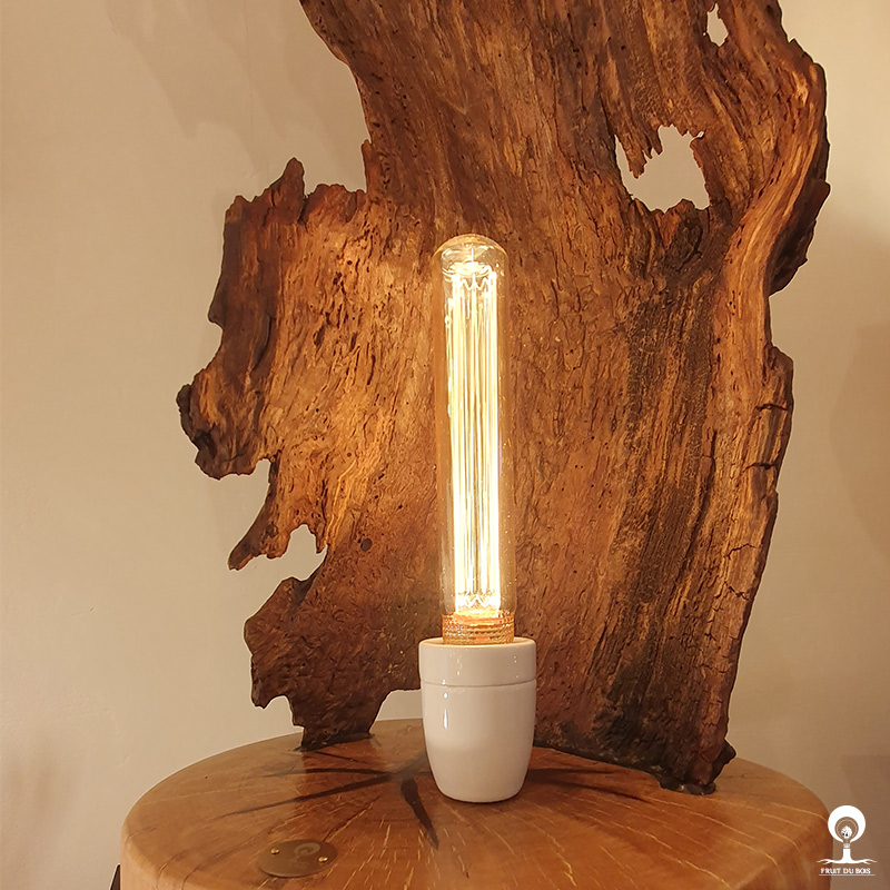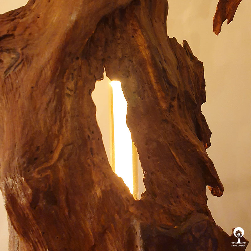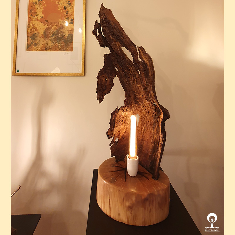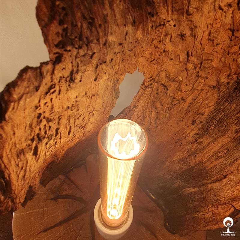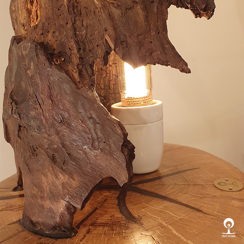 Réalisée à partir d’un morceau de tronc provenant de la forêt du Perche, la lampe Origine conserve son caractère naturel. Ses formes irrégulières sculptées par les éléments témoignent de son histoire. Sa forme élancée, véritable mouvement de bois qui s’élève comme une flamme, renferme en son cœur une source lumineuse qui vient souligner la profondeur de ses textures et créer un jeu d’ombres et de reflets. Montée sur un socle en pin Douglas massif rehaussé de résine, cette lampe allie robustesse et élégance. Elle peut se regarder sur les deux faces en fonction de l’intensité lumineuse désirée et constitue une véritable sculpture lumineuse.